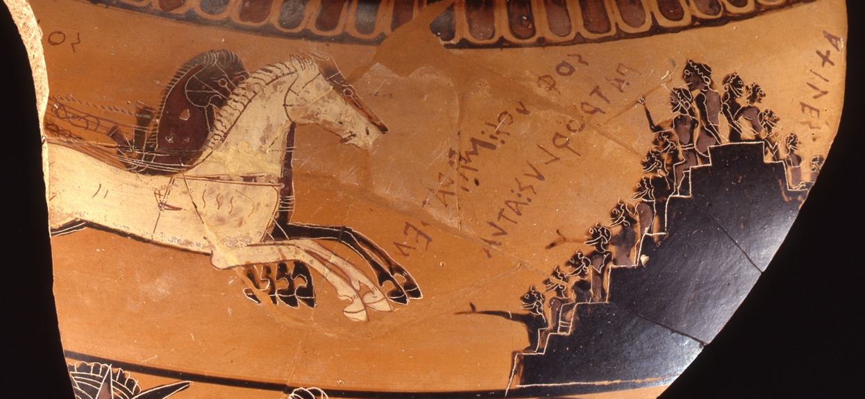 Fragment of an Attic black-figured cauldron (dinos) showing a chariot race and spectators, 6th cent. BCE. Hellenic National Archaeological Museum, Athens, Photographic Archive. Photo: Giannis Patrikianos. © Hellenic Ministry of Culture – Hellenic Organization of Cultural Resources Development (HOCRED).